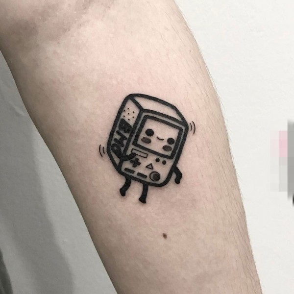 男生手臂上黑色立体几何元素简单线条盒子纹身图片