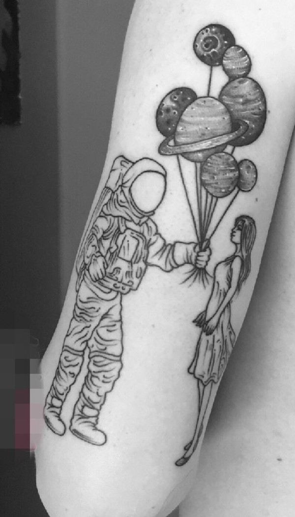 男生手臂上黑灰线条创意宇航员和女孩纹身图片