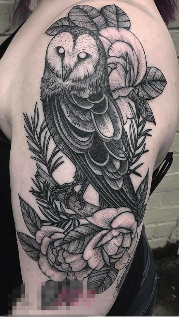 女生手臂上黑色素描点刺技巧猫头鹰花朵纹身图片