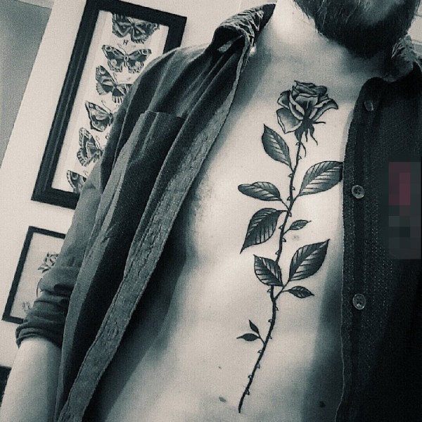 男生胸部黑灰点刺技巧植物素材玫瑰纹身图片