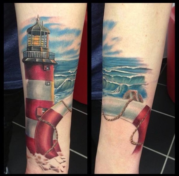 手臂写实的海浪和天然彩色灯塔纹身图案