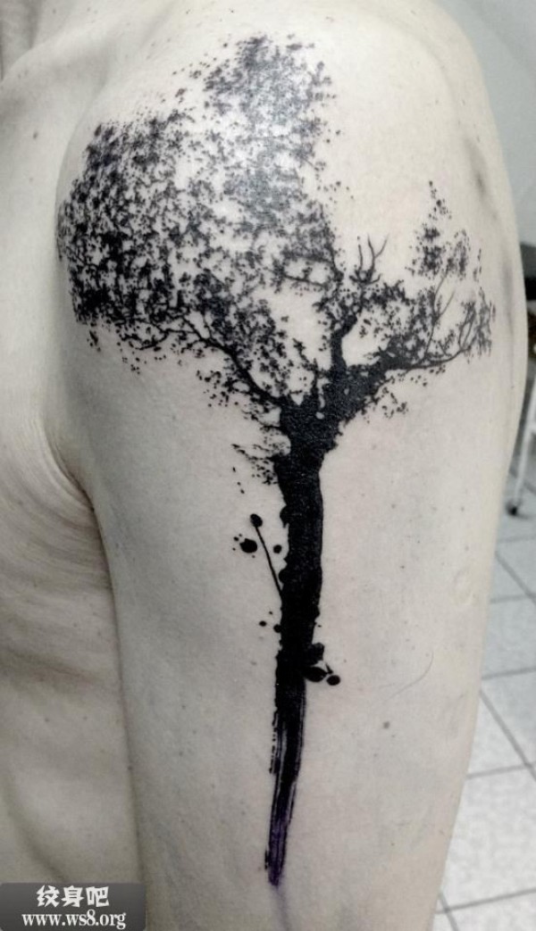 手臂令人印象深刻的黑色树水墨风纹身图案