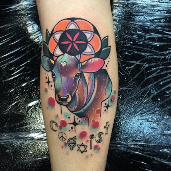 很酷的水彩画风格神秘牛与各种符号手臂纹身图案