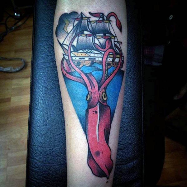 手臂航海主题的彩色鱿鱼和帆船纹身图案