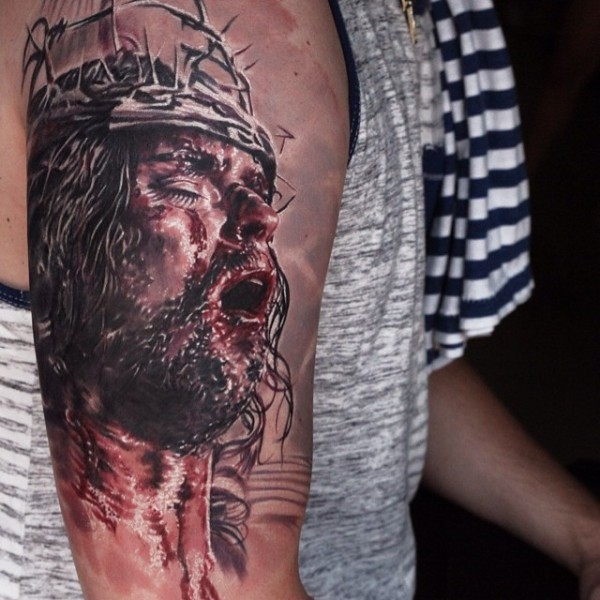 手臂宗教风格血腥的耶稣肖像纹身图案