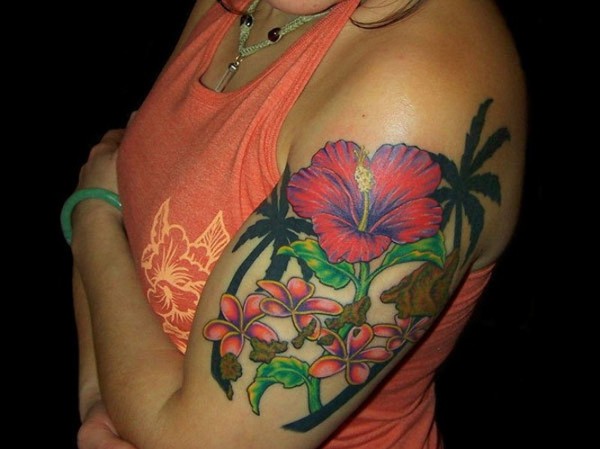 大臂很酷的多彩异国花卉和棕桐树纹身图案