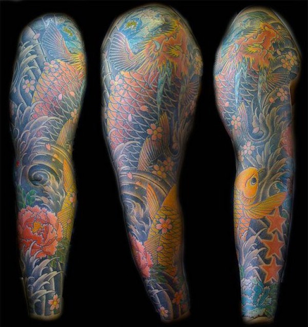 花臂彩色的精美鲤鱼牡丹花纹身图案