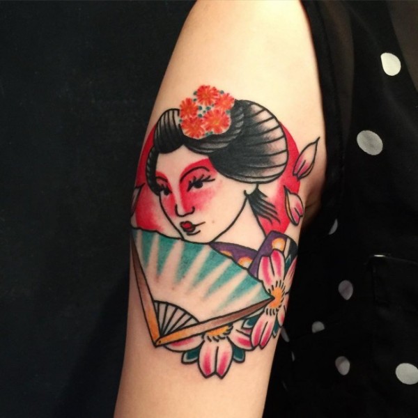 亚洲多彩的艺妓和扇子大臂纹身图案