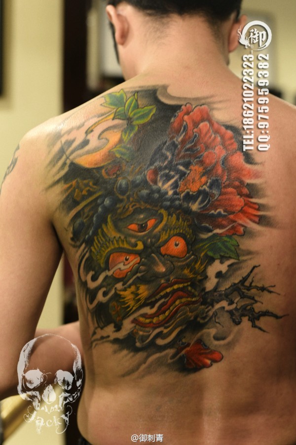 三眼般若搭配富贵牡丹,完美遮盖原本后背的旧图