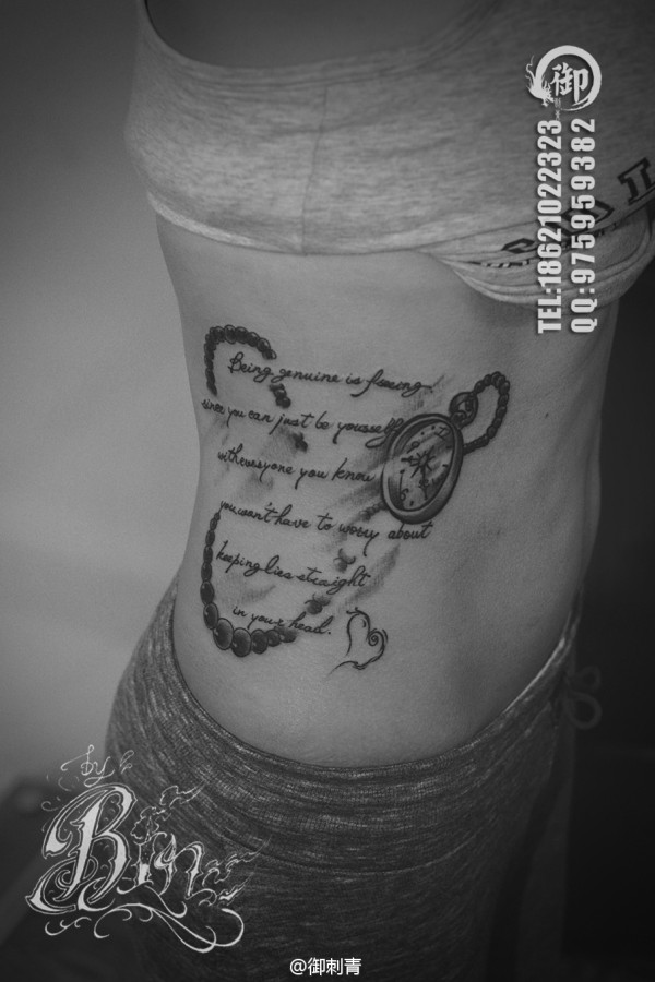 侧腰大篇张花体英文字周围搭配了代表纪念时间的珠链怀表