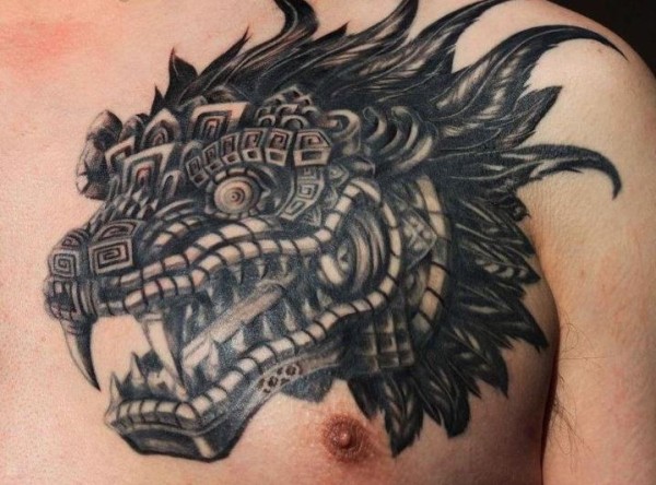 男性胸部羽毛蛇神头部阿兹特克纹身图案