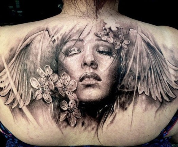 背部写实风格黑灰女性脸与翅膀花朵纹身图案