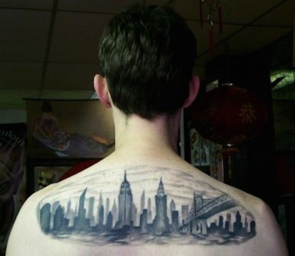 背部黑色的临近城市风景纹身图案
