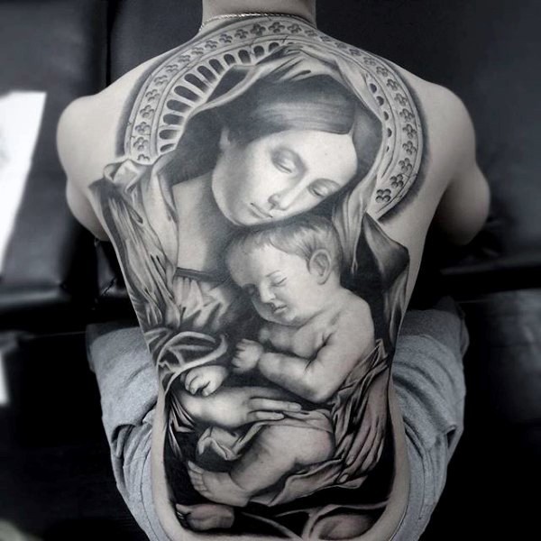 背部写实风格的宗教人物纹身图案