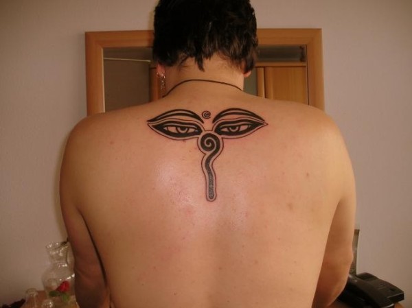 背部黑色粗线条埃及风格的眼睛纹身图案