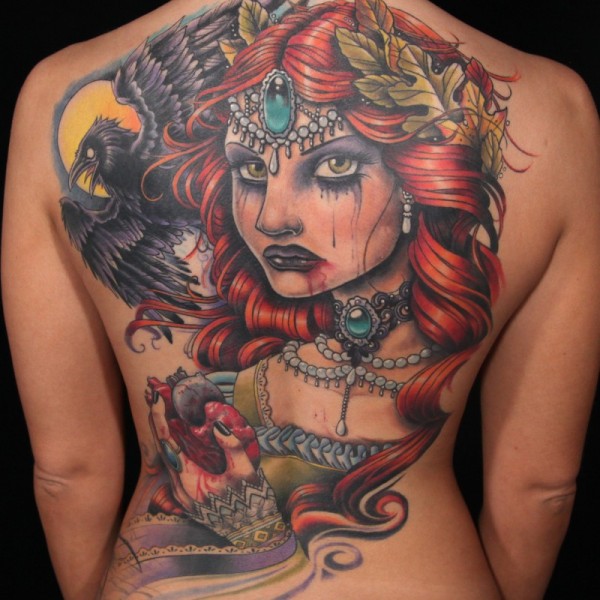 old school彩色血腥女巫和乌鸦心脏背部纹身图案