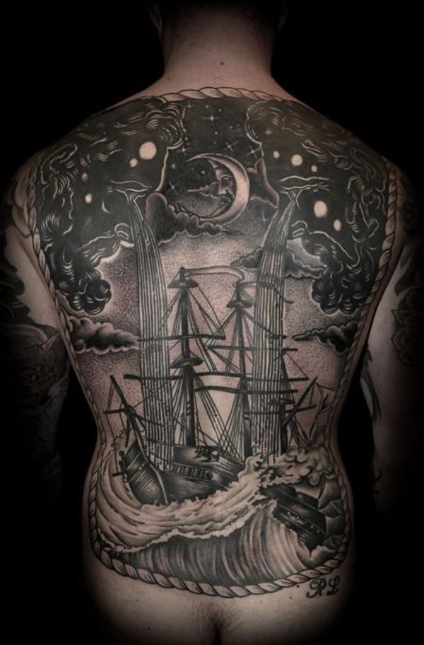 背部惊人的大规模海上帆船纹身图案