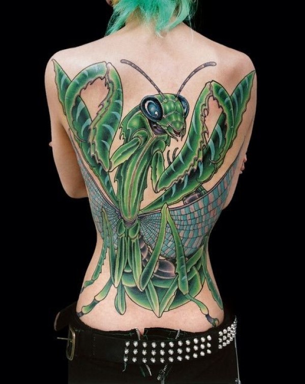 背部绿色的大螳螂精美纹身图案