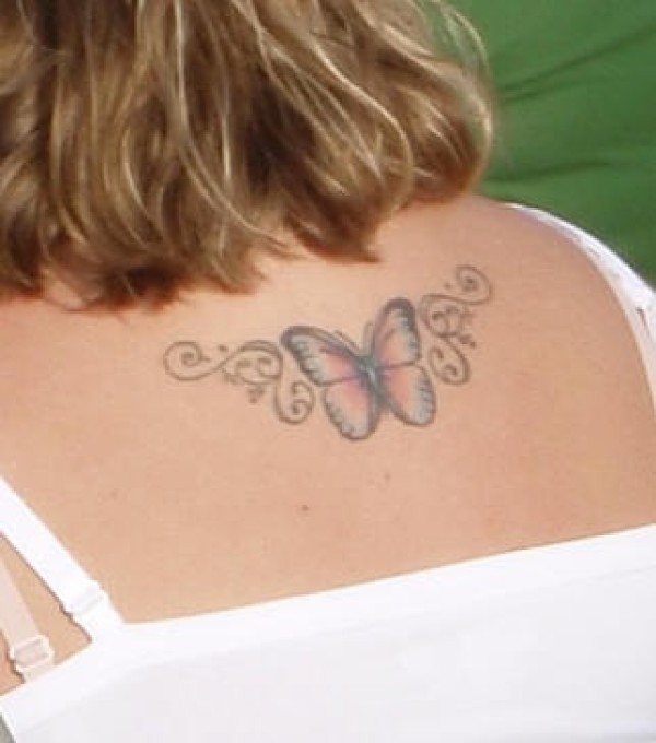 女生背部彩色的蝴蝶藤蔓纹身图案