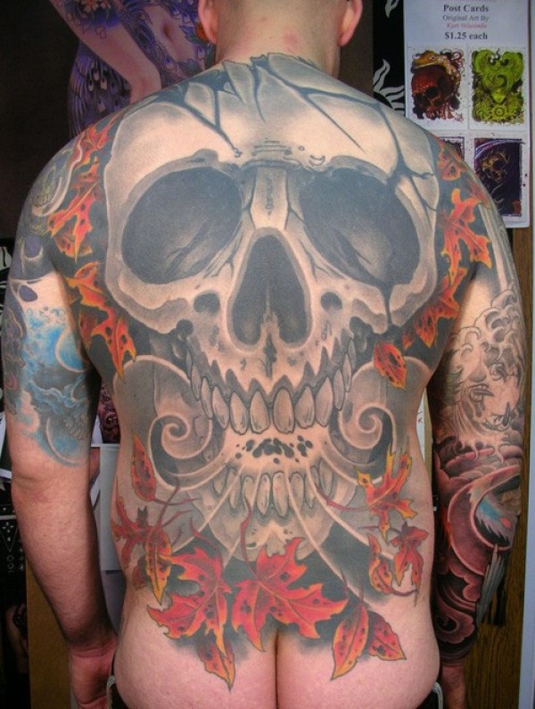 背部死亡的骷髅枫叶纹身图案