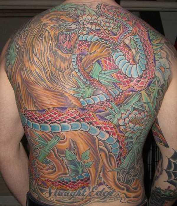 满背彩色的狮子战斗蛇纹身图案