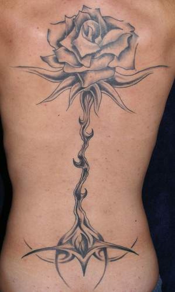 背部黑灰部落玫瑰纹身图案