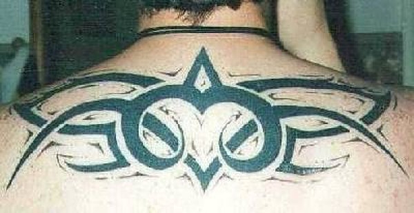男性背部黑色的部落符号纹身图案