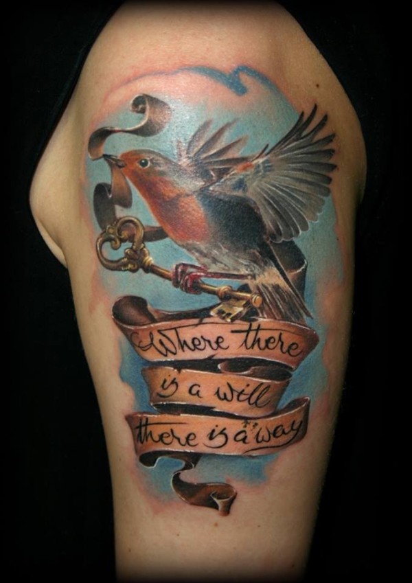 大臂漂亮的彩色小鸟字母钥匙纹身图案