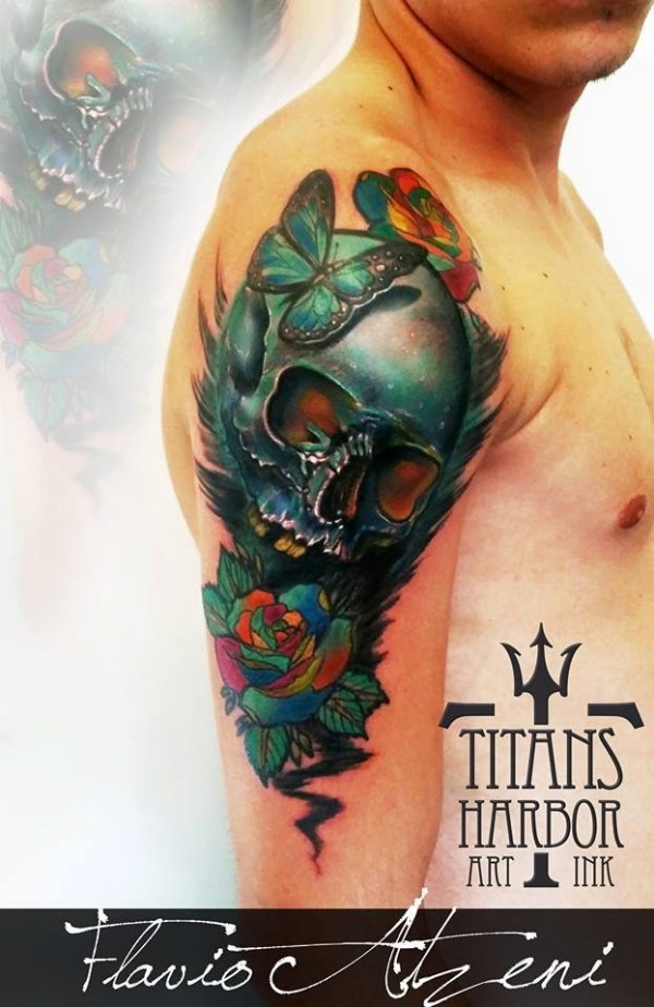 肩部美丽的七彩骷髅和蝴蝶玫瑰纹身图案
