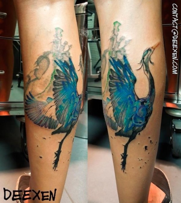 小腿美丽的彩色鸟纹身图案