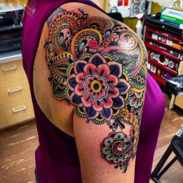 彩色肩部纹身装饰风格花朵纹身图案