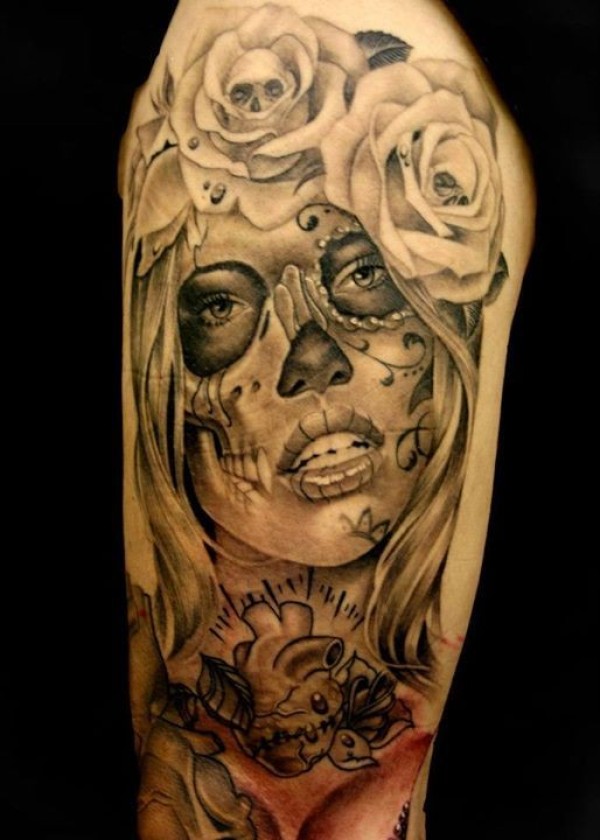 墨西哥式黑白女性肖像玫瑰纹身图案