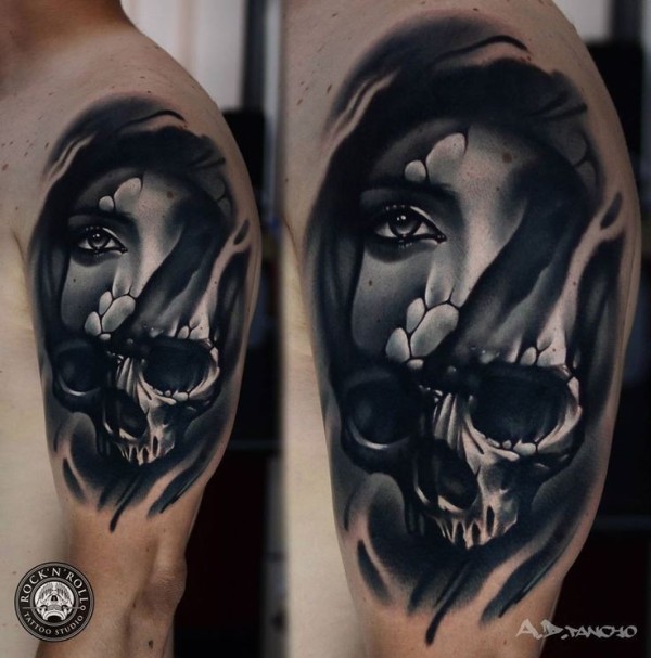 大臂恐怖风格黑白妇女脸和骷髅纹身图案