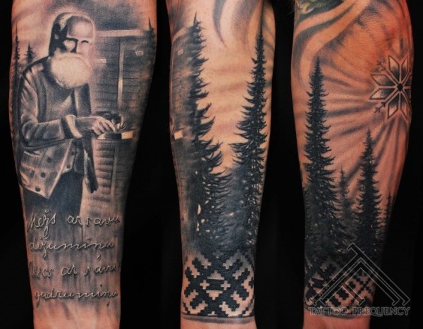 手臂纪念风格黑白老人字母和森林纹身图案