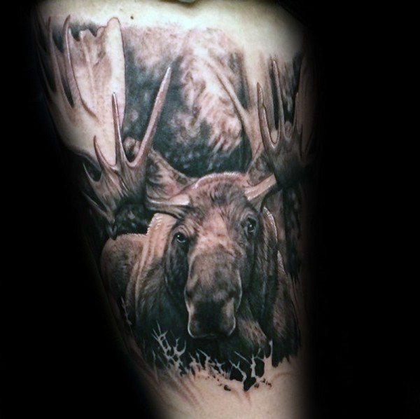 写实逼真的黑白麋鹿在树林里大腿纹身图案