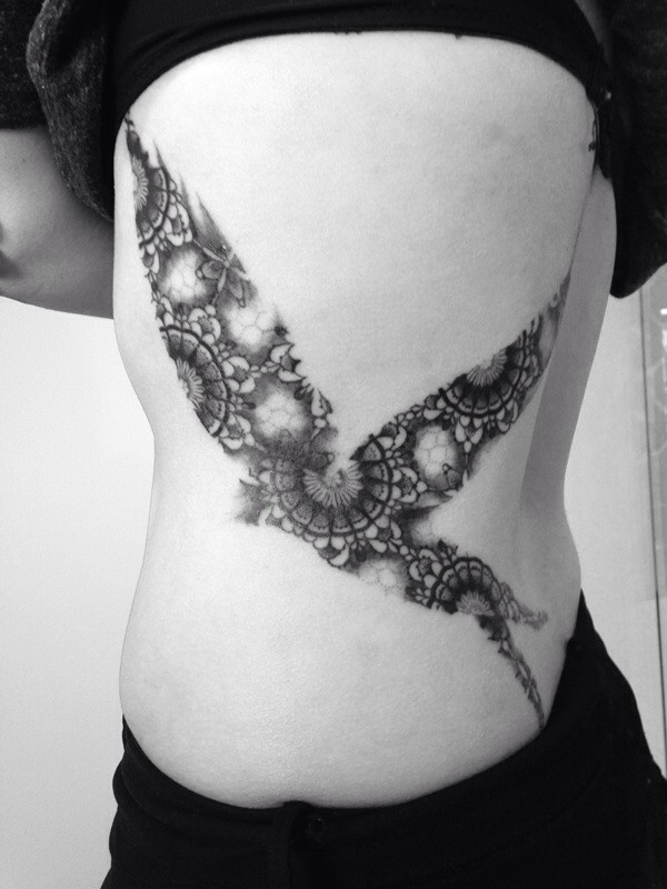 女生后腰纹身黑白灰风格抽象线条纹身图案