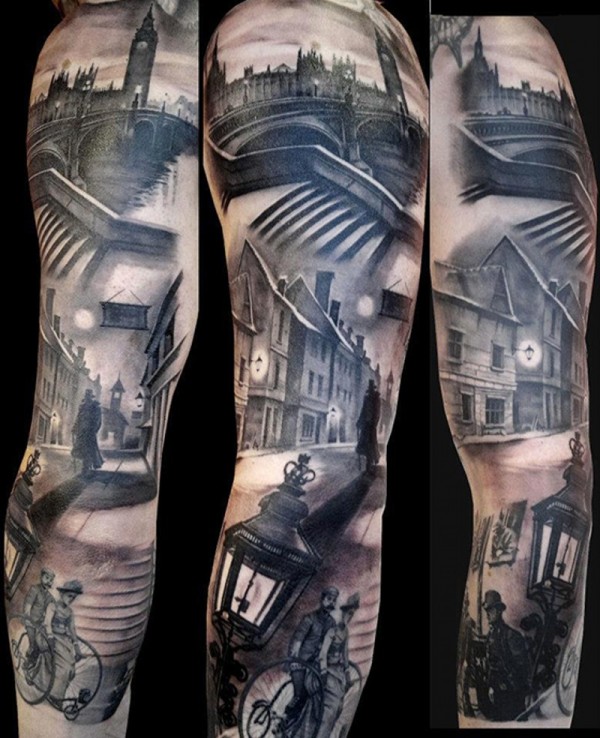 手臂奇妙的黑灰滑稽伦敦城市纹身图案