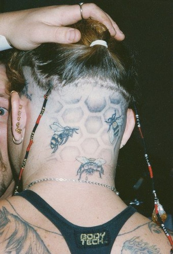 头部黑白飞行蜜蜂和蜂窝纹身图案