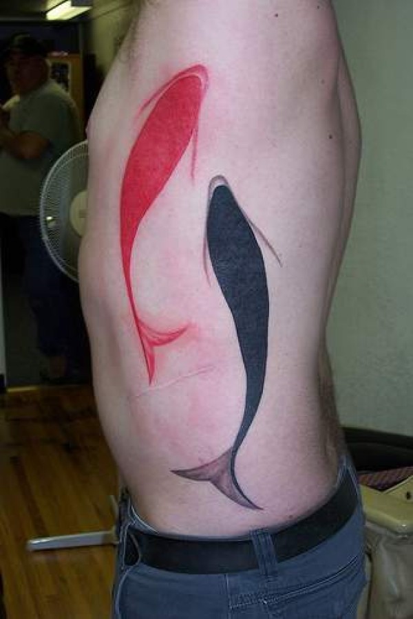 简约的黑色和红色鲤鱼侧肋纹身图案