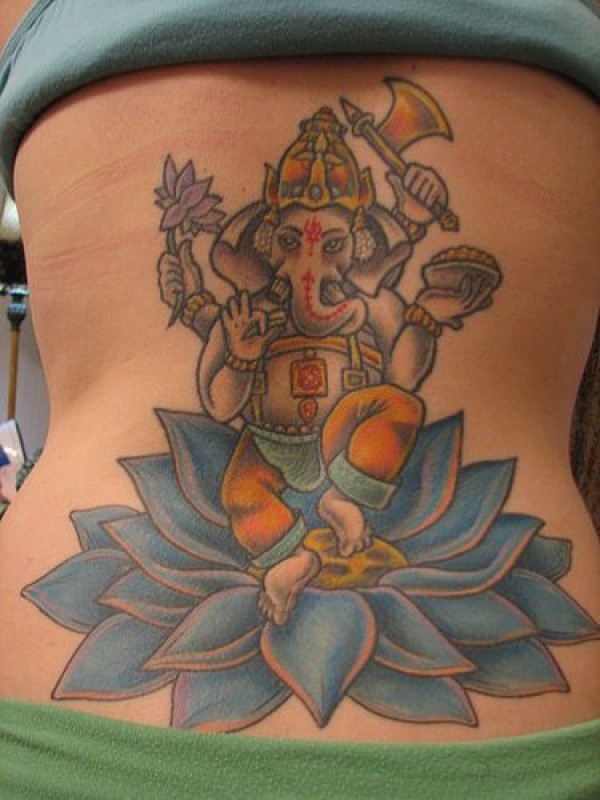 背部象神伽内什跳舞和蓝色莲花纹身图案