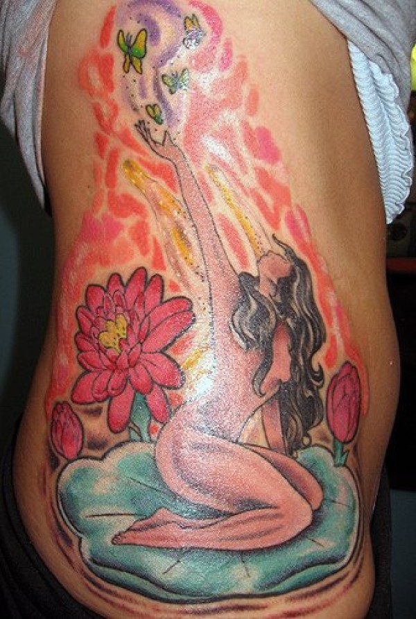 侧肋赤裸的女孩和蓝色莲花纹身图案