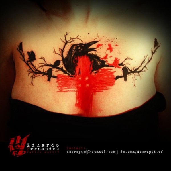 胸部红色的大十字架和鸦在树枝上纹身图案
