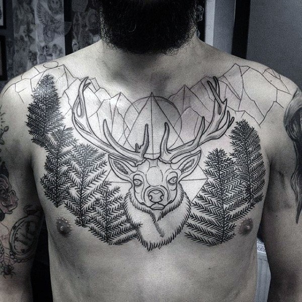 胸部几何山脉和树鹿头纹身图案