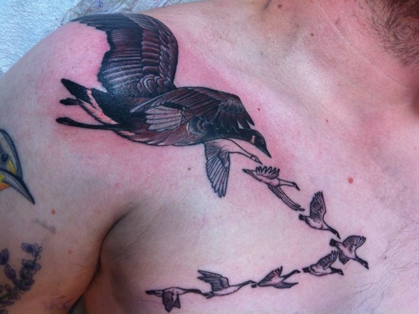 肩部和胸部成群的野鸭纹身图案