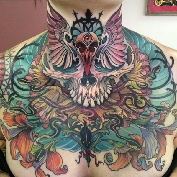 胸部大面积old school彩色蛇骷髅花朵纹身图案