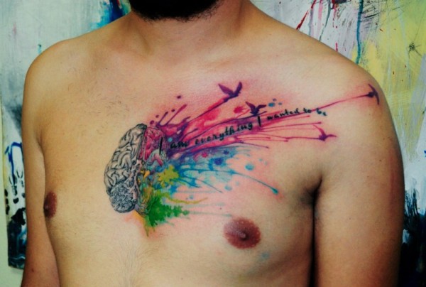 胸部五彩泼墨人脑和字母小鸟纹身图案