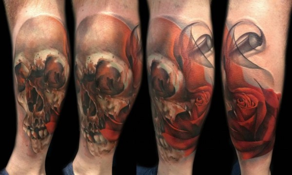 小腿彩色的骷髅与玫瑰纹身图案