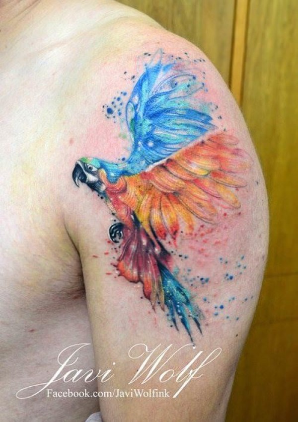 肩部水彩风格飞行的鹦鹉纹身图案