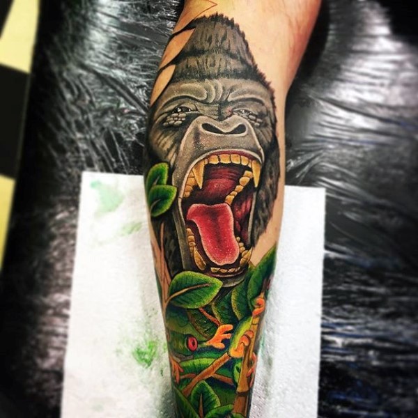 彩色的咆哮大猩猩和热带青蛙纹身图案