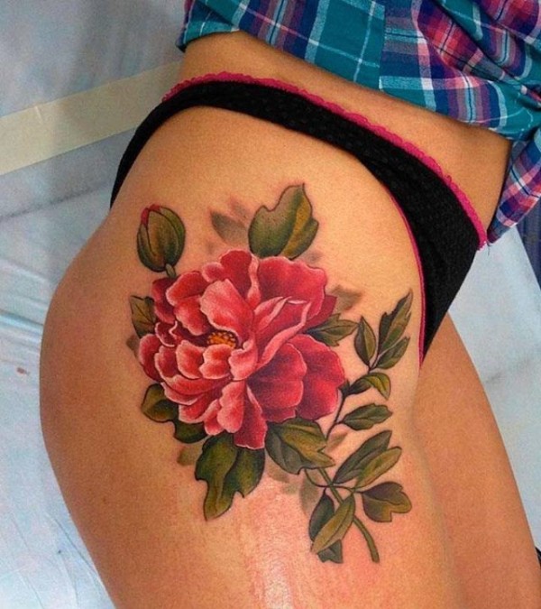 大臂写实逼真的红色牡丹花纹身图案